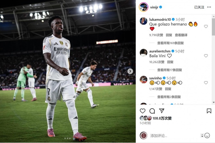 维尼修斯社媒晒出比赛照片,莫德里奇留言评论:“多么精彩的进球,兄弟。”