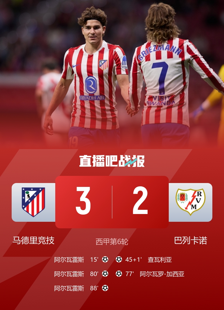 西甲第6轮,阿尔瓦雷斯帽子戏法,马竞3-2逆转巴列卡诺。