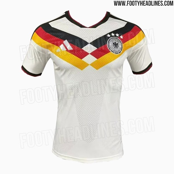 球衣主体为白色,并结合了德国国旗的黑、红、黄三色。一个引人注目的三色V形设计从肩部一直延伸到胸前上方。