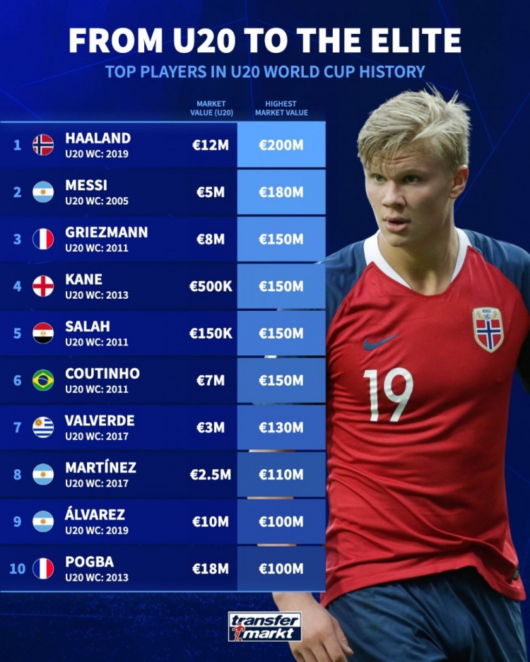 德转统计U20世界杯球星身价变化:梅西500万→1.8亿,哈兰德最高