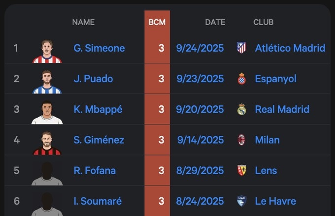 9月25日讯 Stat Muse统计了五大联赛单场错失重大机会最多的球员,有六人单场错失3次重大机会,并列第一。