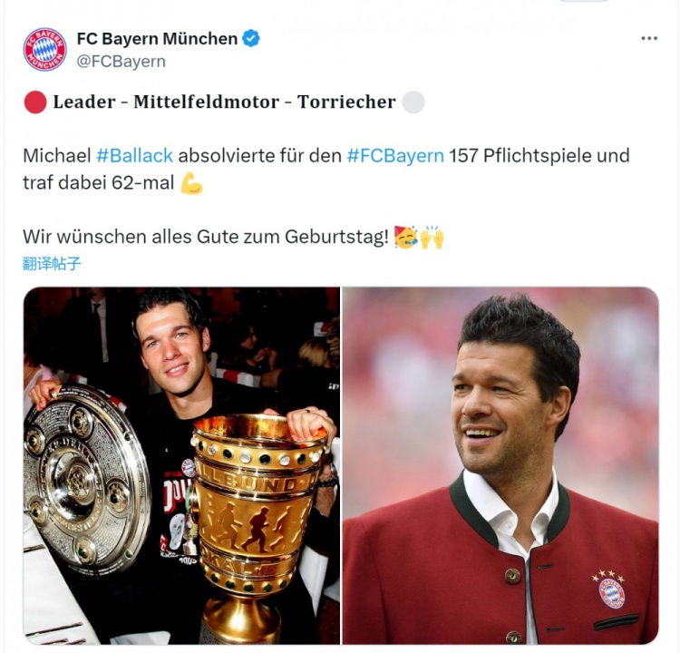 拜仁官方社媒晒出巴拉克效力球队时期的照片,配文:“领袖-中场发动机-进球机器。巴拉克为拜仁出战157场正式比赛,打进62球,祝你生日快乐!”