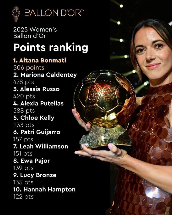 09月27日讯 《法国足球》公布金球奖各排名得分情况,女足方面,邦马蒂以506分夺得金球奖,领先第二的卡尔登泰28分。