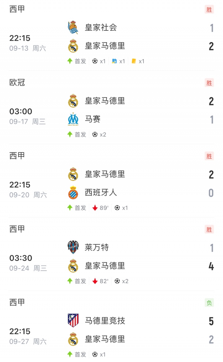 姆巴佩本场为皇马首开记录,他目前已经连续5场为皇马破门。