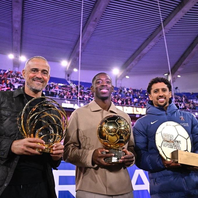 登贝莱在获得金球奖,马尔基尼奥斯作为队长则拿着巴黎的最佳男足俱乐部奖,恩里克则获得苏格拉底奖,巴黎官推晒出三人三奖杯的合影并写道:“集体的力量。”