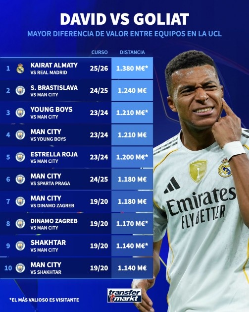 9月30日讯 欧冠联赛阶段第2轮,皇马将做客对阵阿拉木图凯拉特。“转会市场网”统计了欧冠单场对决双方身价差距最悬殊的10场比赛,除皇马对阵阿拉木图凯拉特的比赛排名第一之外,该榜单上其余9组对决全部由曼城及其对手创造。